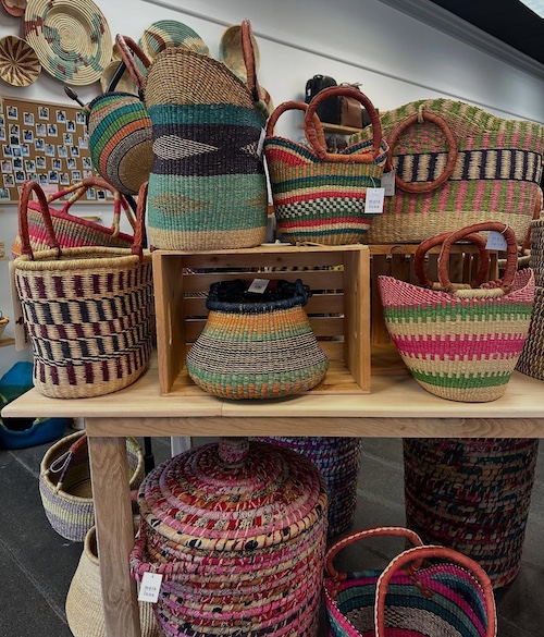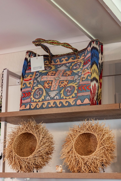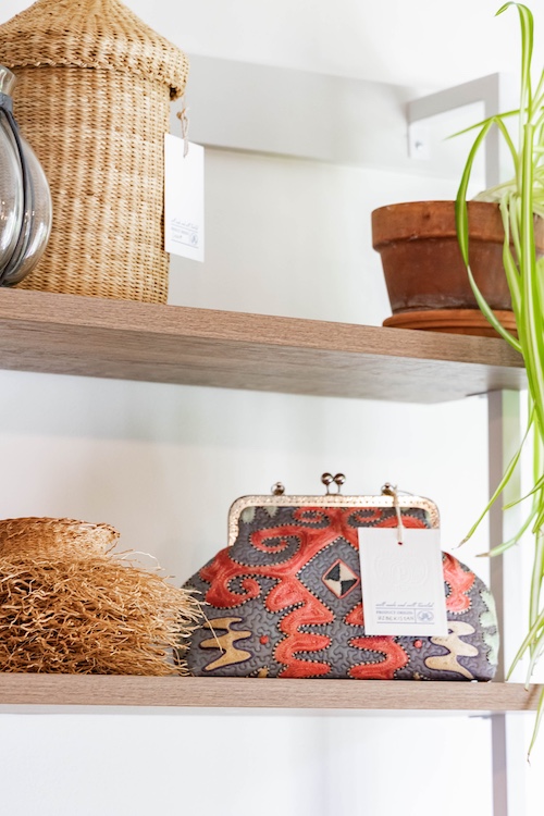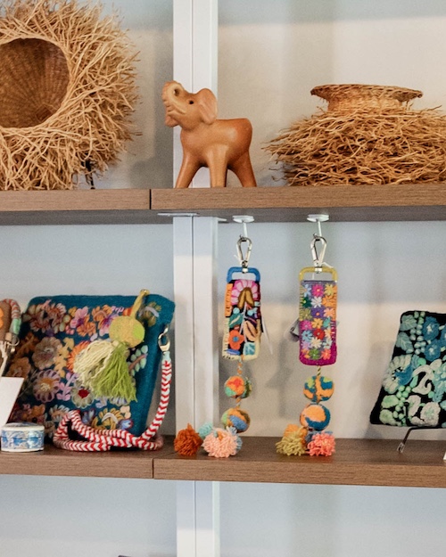 Hand-embroidered Suzani purses from Uzbekistan, Vetiver baskets from Madagascar, Mohair/Wool blankets from Ireland, handwoven tea towels, Bolga market baskets, handcrafted ceramic coffee mugs.