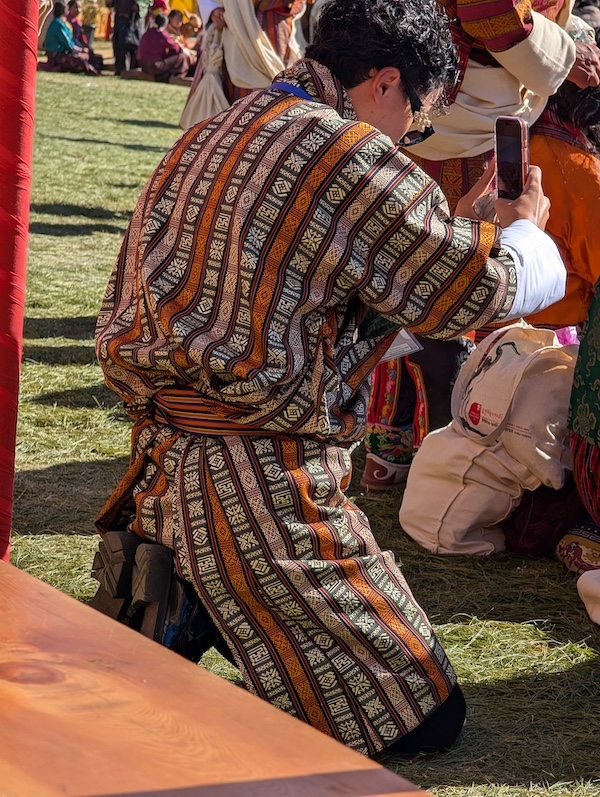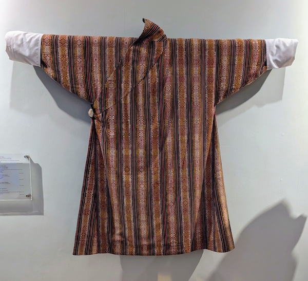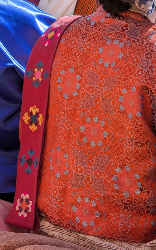 Our first destination in Bhutan was Thimphu, the capital and home of Druk Vana. The city is a textile lover’s dream, from the Royal Academy of Textiles, which serves as a national center for preserving weaving traditions, to its Bhutanese Crafts Bazaar. I was immediately struck by the sight of residents going about their daily business in gorgeous, intricately designed, hand-woven clothing that seemed to outnumber Western attire. Our guide explained that in 1989, the gho (a knee-length robe for men) and the kira (a vibrant, wrapped ankle-length dress for women), both of which have been worn for centuries, were proclaimed Bhutan’s national dress to be worn in schools, offices, and temples, as well as at their festivals—a potent expression of the country’s identity and the importance of its textile heritage.