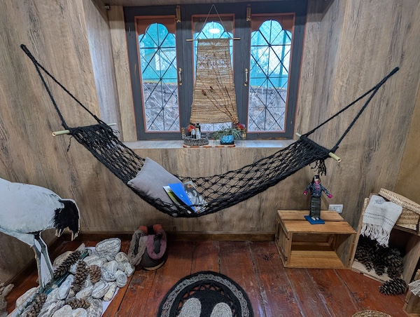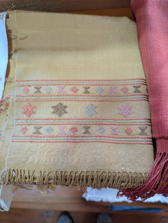 We also saw several research and development projects, including bags, placemats, and even a hammock crocheted from yak wool as part of a collaboration with a Nepali trainer. Another standout was a gorgeous shawl woven on a Gujarati loom but featuring intricate, traditional Bhutanese motifs.
