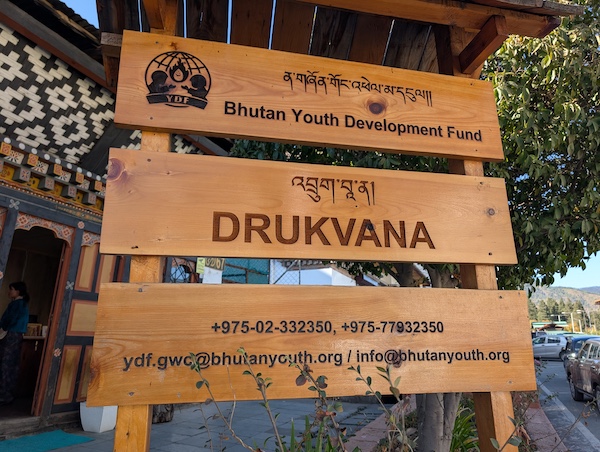 Con este contexto en mente, nos propusimos ver cómo la próxima generación de artesanos está llevando estas tradiciones hacia el futuro. Mi esposo y yo llegamos a Druk Vana en una tarde fresca y soleada, y fuimos recibidos por Karma Dema, Oficial Principal de la Empresa Social de Druk Vana.
